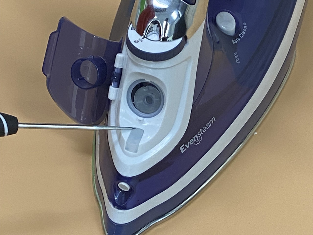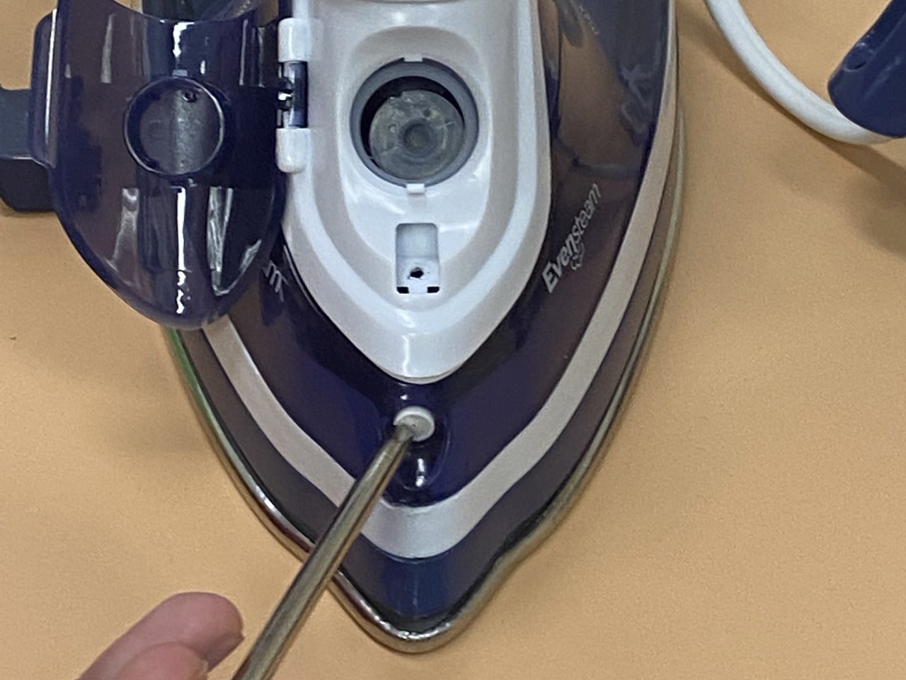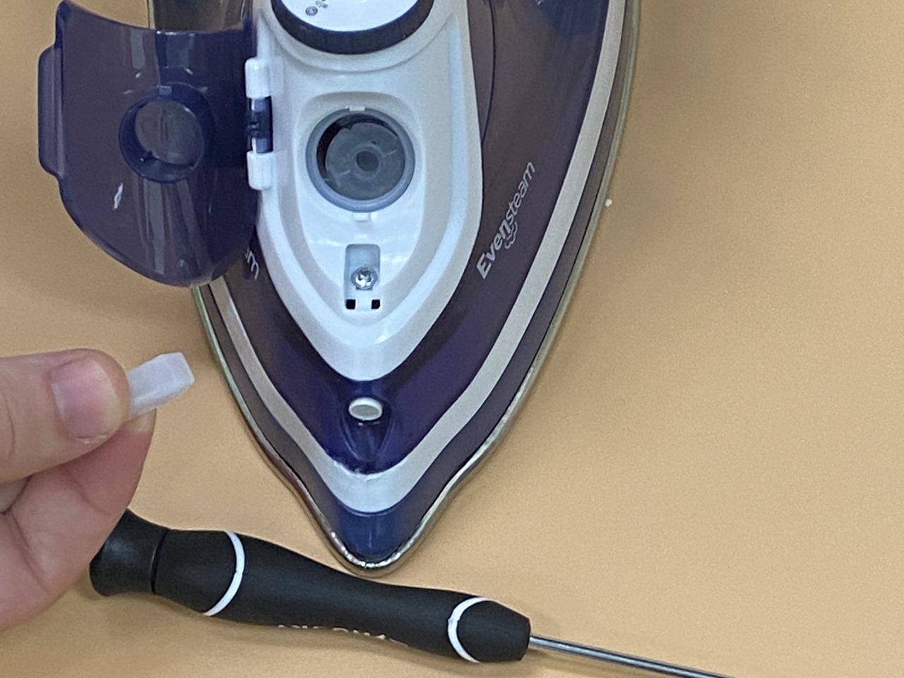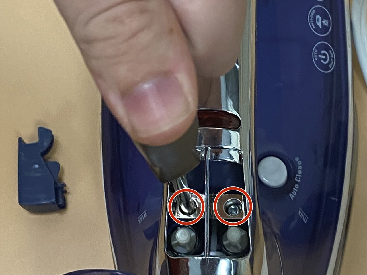 برای دسترسی به پیچهای بدنه اصلی، اغلب باید دکمههای اسپری آب و بخار را بردارید، با استفاده از اسپاتول یا ناخن، به آرامی زیر دکمههای روی دسته اهرم کنید و آنها را به سمت بالا بکشید تا جدا شوند. (مراقب باشید خارها نشکنند). زیر این دکمهها معمولاً یک پیچ مخفی وجود دارد. آن را باز کنید. پیچ موجود در قسمت نوک (جلو) اتو را هم باز کنید (گاهی زیر درپوش مخزن آب پنهان است).