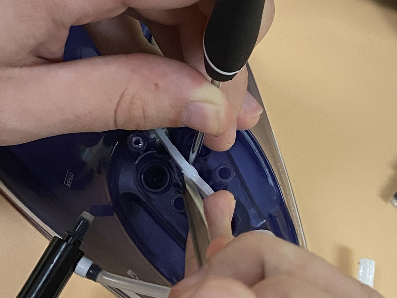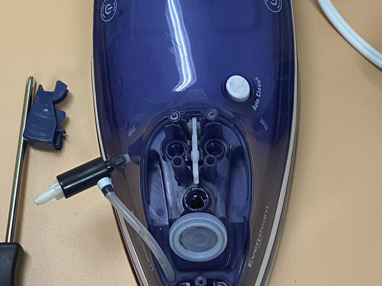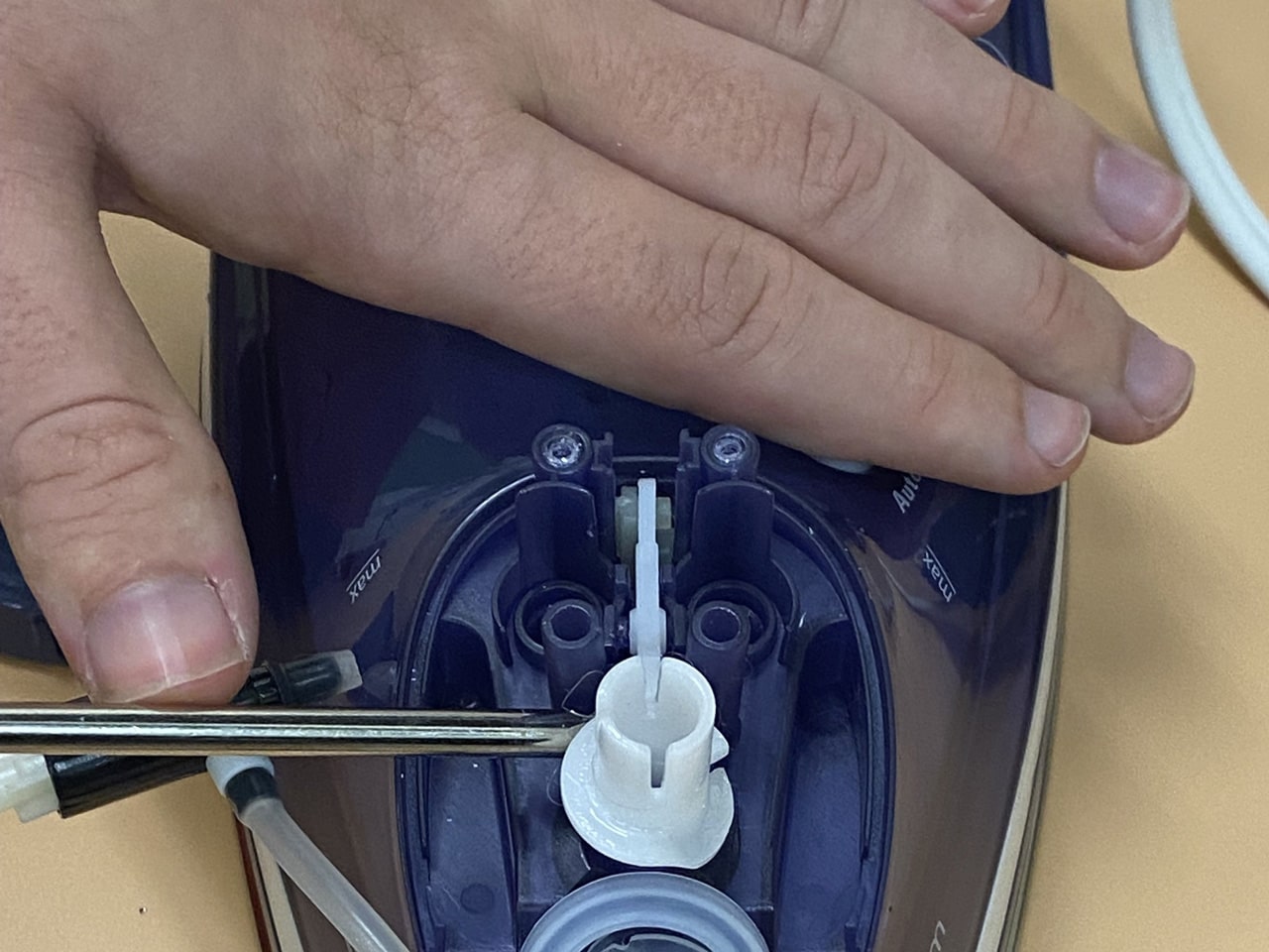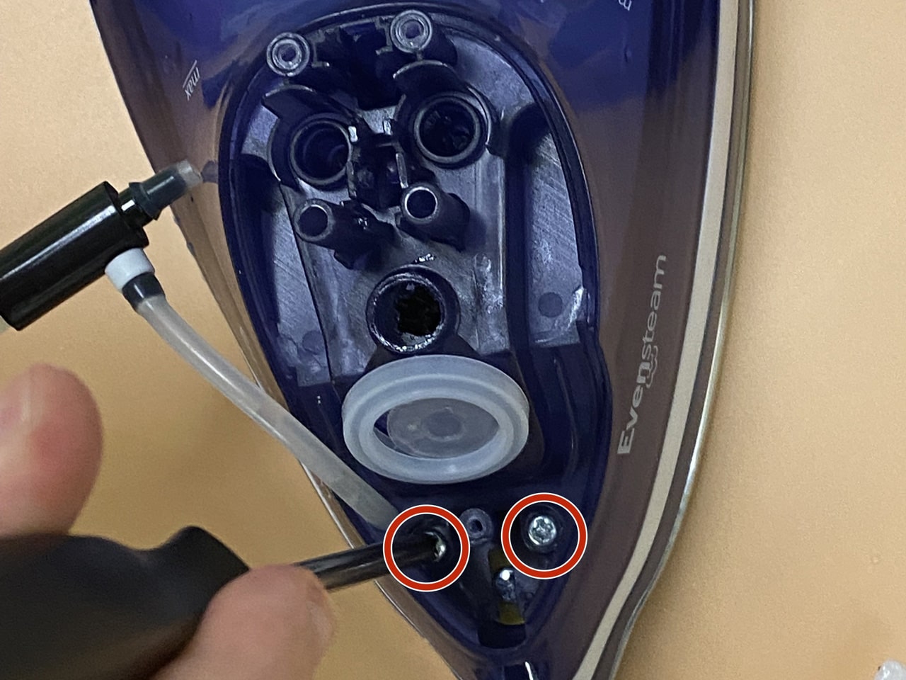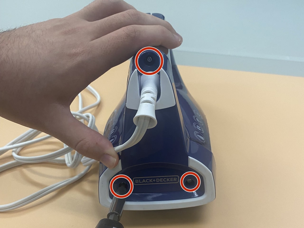 برای دسترسی به پیچهای بدنه اصلی، اغلب باید دکمههای اسپری آب و بخار را بردارید، با استفاده از اسپاتول یا ناخن، به آرامی زیر دکمههای روی دسته اهرم کنید و آنها را به سمت بالا بکشید تا جدا شوند. (مراقب باشید خارها نشکنند). زیر این دکمهها معمولاً یک پیچ مخفی وجود دارد. آن را باز کنید. پیچ موجود در قسمت نوک (جلو) اتو را هم باز کنید (گاهی زیر درپوش مخزن آب پنهان است).
