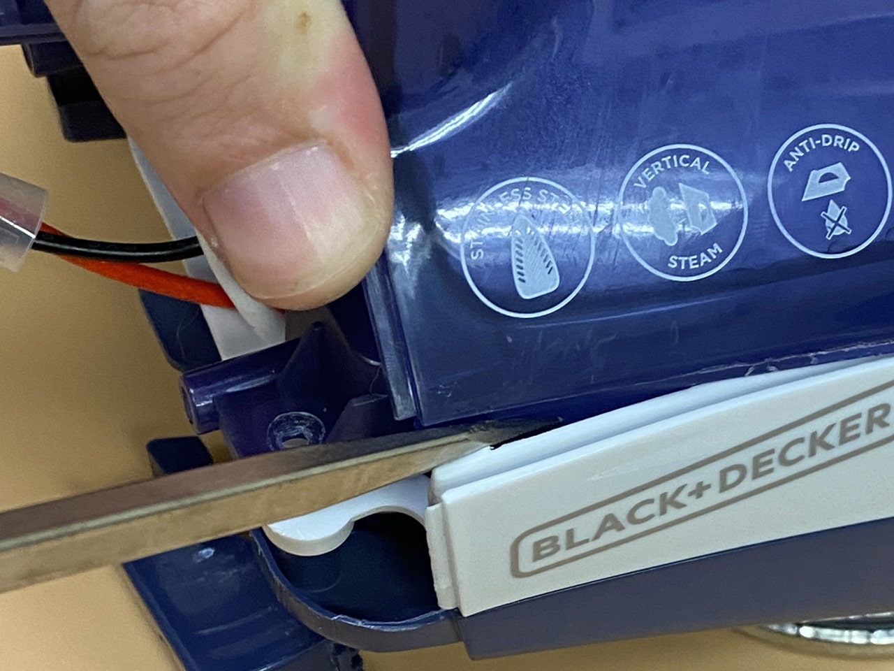 حالا که پیچهای اصلی باز شدهاند، باید بدنه پلاستیکی و دسته را از کفی فلزی اتو جدا کنید. ممکن است خارهای پلاستیکی در اطراف بدنه وجود داشته باشد. با قاببازکن دور تا دور بدنه را آزاد کنید. دسته را با احتیاط بلند کنید.