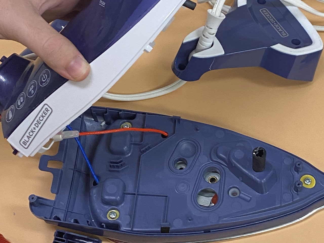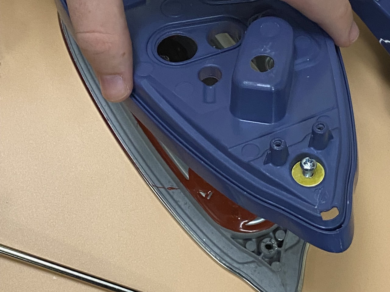 اکنون کفی فلزی اتو و قطعات داخلی را میبینید، در مرکز کفی فلزی، قطعهای را میبینید که سیمهایی به آن متصل است و یک محور چرخان دارد. این همان رگولاتور دما است. قبل از باز کردن سیمها، حتماً یک عکس بگیرید تا در هنگام بستن، جای سیمها را فراموش نکنید.
