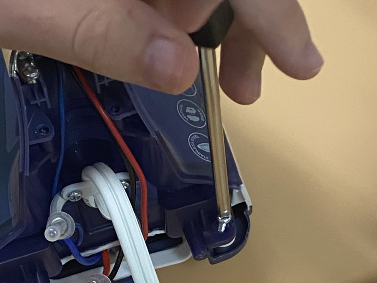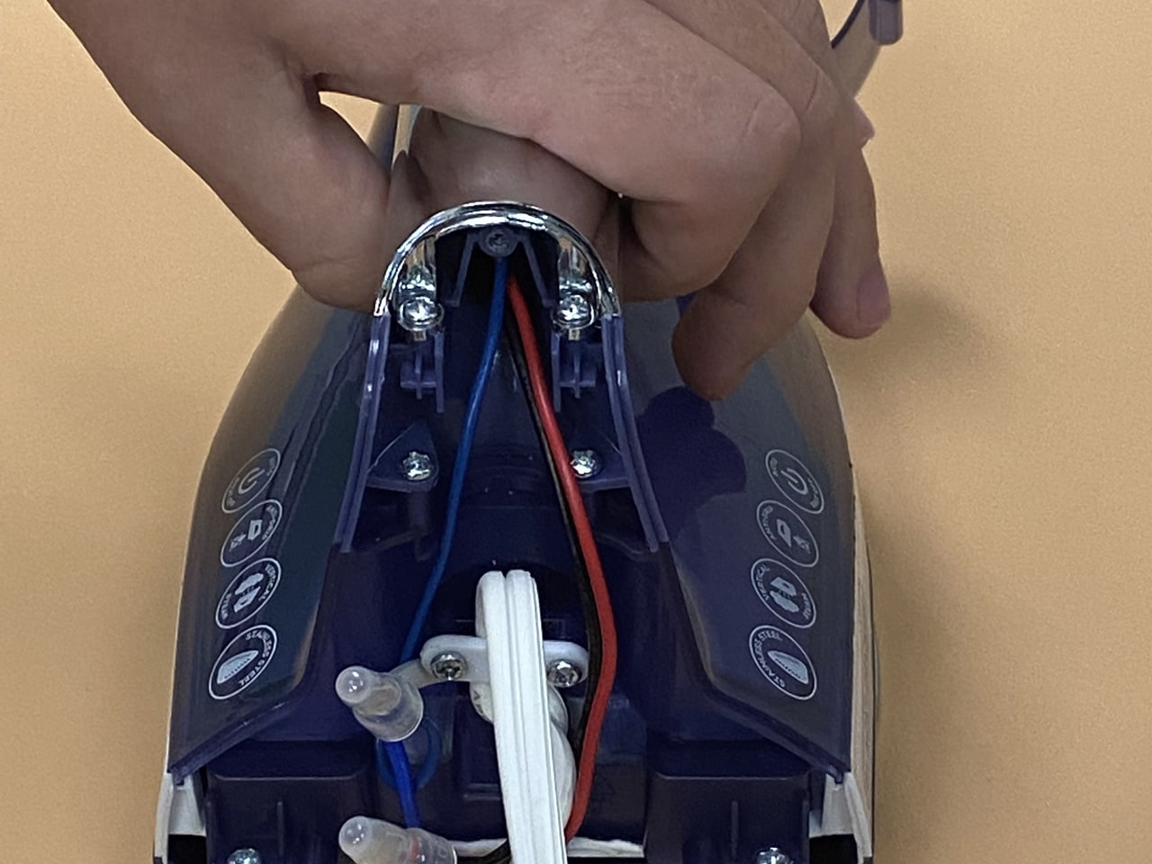 اتو را روی یک سطح صاف قرار دهید. به پشت اتو (جایی که سیم برق وارد میشود) نگاه کنید. معمولاً یک یا دو پیچ در این قسمت وجود دارد. با استفاده از پیچگوشتی مناسب، پیچهای قاب عقبی را باز کنید و قاب را به آرامی جدا کنید تا اتصالات سیمکشی نمایان شود.