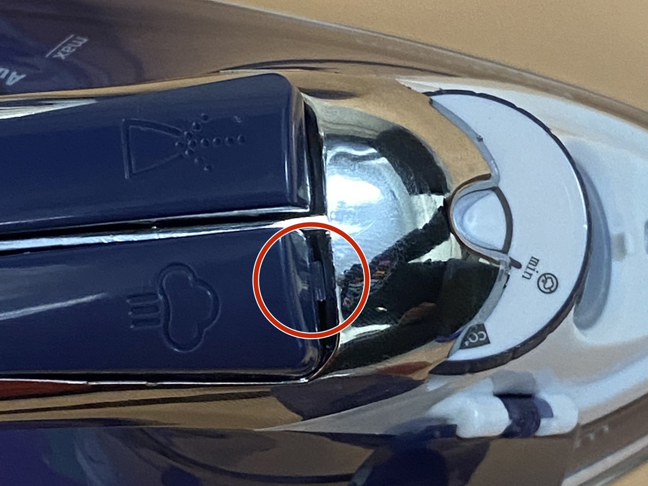 - قبل از بستن قاب پلاستیکی، مطمئن شوید که محور ترموستات دقیقاً در وضعیتی قرار دارد که با دکمه چرخان روی بدنه هماهنگ باشد (مثلاً هر دو را روی حالت “خاموش/Min” قرار دهید). اگر این دو همراستا نباشند، بعد از بستن اتو، درجه دما اشتباه کار میکند.