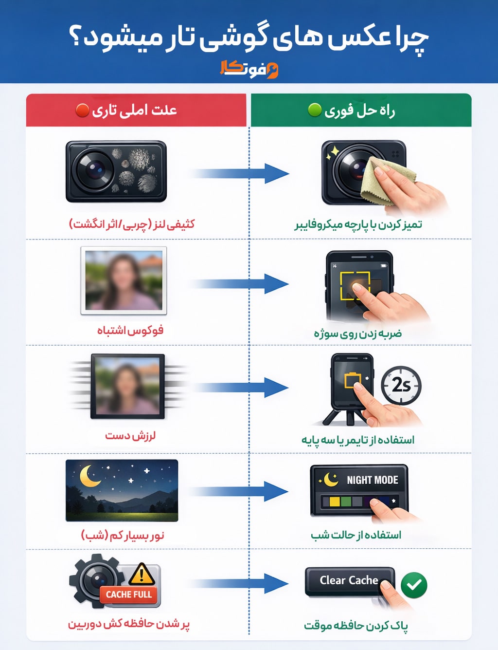 گاهی اوقات انباشته شدن فایلهای موقت (Cache) در اپلیکیشن دوربین یا تداخل نرم افزاری باعث کندی در فوکوس و تاری عکسها میشود.